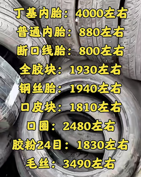 据公开市场数据显示,当前废旧轮胎回收价格普遍坚挺:废旧丁基内胎价格徘徊在4000元/吨左右,毛丝价格高达3490元/吨,口圈报价约2480元/吨,全胶块与钢丝胎价格也分别达到1930元/吨和1940元/吨以上。